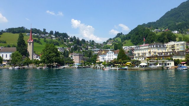 O passeio fica ainda mais interessante se você pegar um barco em Lucerna. Além da maravilhosa vista do lago com as montanhas ao fundo, o serviço de transporte é mais rápido – 40 minutos – e coberto pelo Swiss Pass.