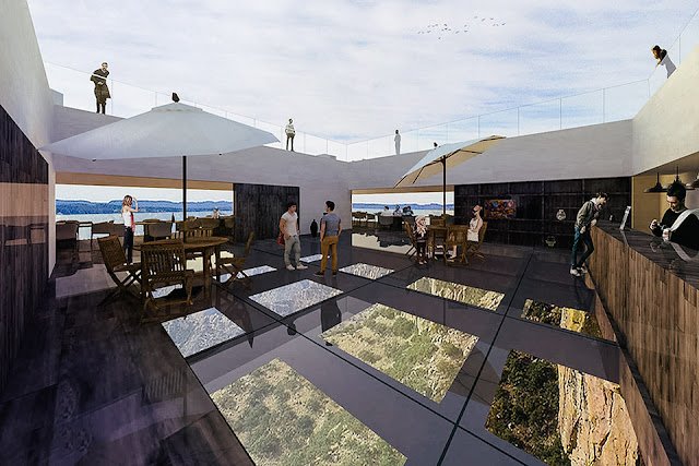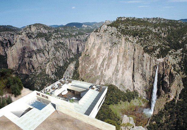 No outro, vai funcionar o restaurante, com mesas ao longo da murada. Tem ainda uma piscina, de fundo transparente, para dar a sensação de estar flutuando sobre as montanhas com vista para a bela queda d´água.