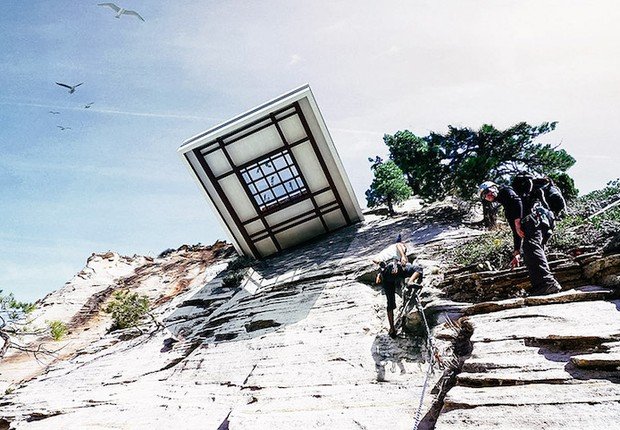 Com projeto arrojado e minimalista, da Tall Arquitetos, ele tem a forma de um quadrado, que se projeta para fora da encosta, muito acima do cânion. São dois andares. No inferior, onde fica o bar, o piso de vidro escancara o fundo do cânion.